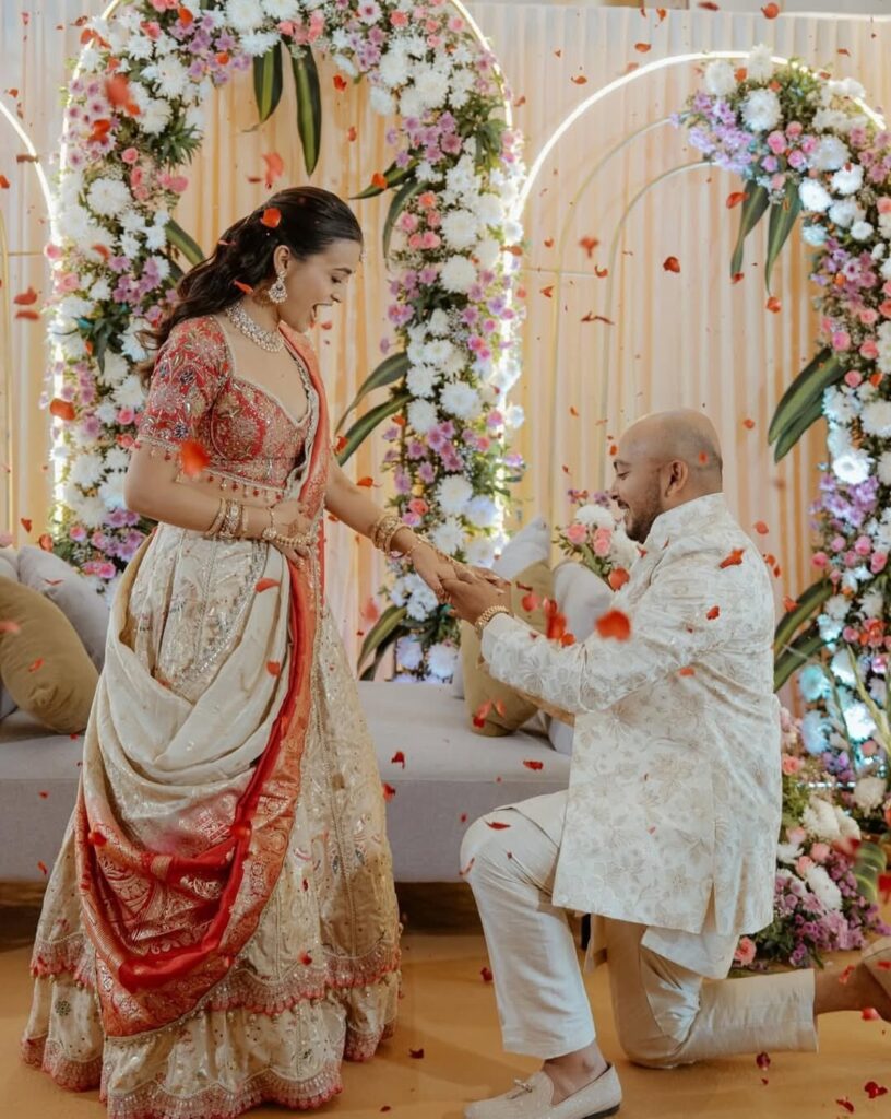 सगाई की तस्वीरों में सबसे खास पल वह है जब Prithvi Shaw घुटनों के बल बैठकर Akriti Agarwal को अंगूठी पहनाते नजर आते हैं। यह तस्वीर सोशल मीडिया पर खूब वायरल हो रही है।