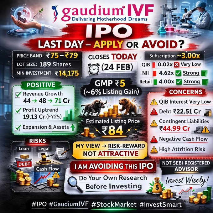 शेयर बाजार में इस समय SME सेगमेंट के आईपीओ को लेकर जबरदस्त हलचल है। इसी बीच फर्टिलिटी और IVF सेवाओं से जुड़ी कंपनी Gaudium IVF का आईपीओ निवेशकों के बीच चर्चा का बड़ा विषय बन गया है। दूसरे दिन ही यह इश्यू पूरी तरह सब्सक्राइब हो गया और रिटेल निवेशकों ने इसमें बढ़-चढ़कर हिस्सा लिया। ग्रे मार्केट में भी इसका GMP करीब 9% प्रीमियम का संकेत दे रहा है, जिससे लिस्टिंग गेन की उम्मीदें मजबूत हुई हैं। taazanews24x7.com