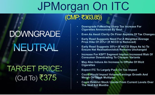 स्थानीय BROKERAGE फ़र्म Nuvama Institutional Equities ने ITC के SHARE रेटिंग को “BUY” से “HOLD” में डाउनग्रेड कर दिया है। उनका कहना है कि कर वृद्धि की तीव्रता अपेक्षा से अधिक है, जिसके चलते सिगरेट की कीमतों में लगभग 20 % वृद्धि की संभावना है, जो बिक्री मात्रा को प्रभावित कर सकती है।