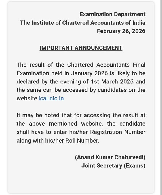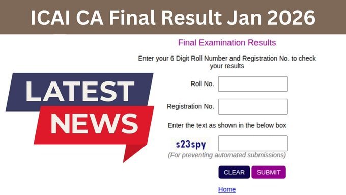 ICAI CA Final Result January 2026 का इंतजार अब समाप्ति की ओर है। लाखों उम्मीदवारों की मेहनत आज रंग लाने वाली है। पास प्रतिशत चाहे जो भी रहे, असली जीत उस समर्पण और धैर्य की है जो इस परीक्षा की तैयारी के दौरान दिखाया गया।