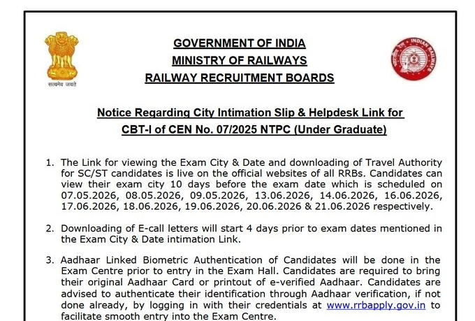 इस बार भी कुछ ऐसा ही हुआ है। RRB ने NTPC UG परीक्षा 2026 के लिए City Intimation Slip जारी कर दी है।